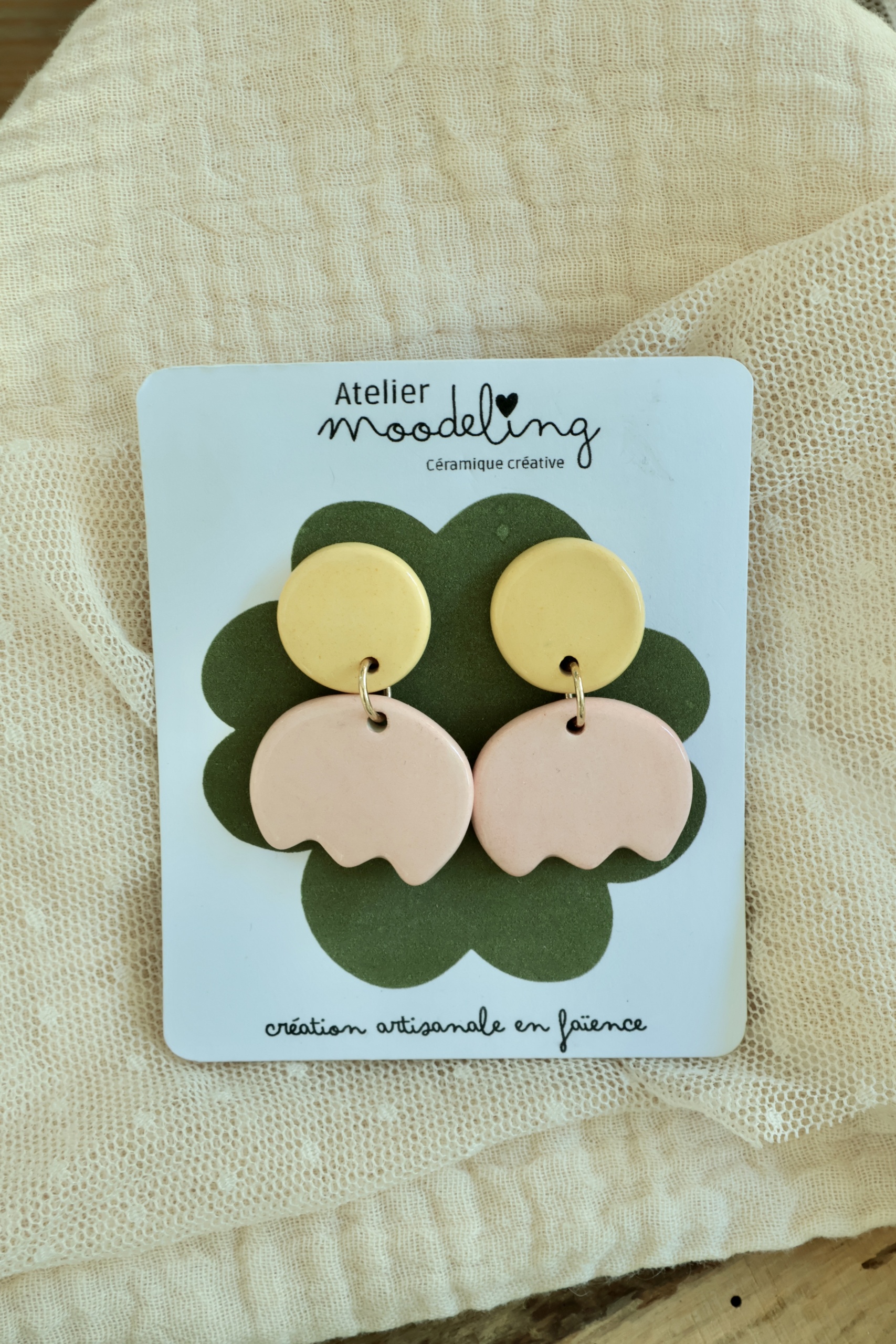 Paire de boucle d’oreille en faïence, entièrement fabriquée et décorée à la main. Chaque pièce est unique et ne se ressemble pas.